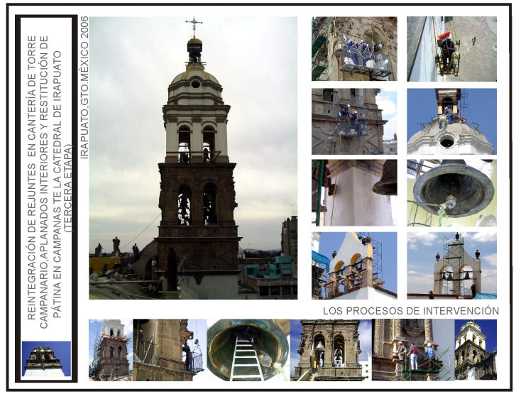 Intervención de reintegración de boquillas en cantería de la torre campanario, aplanados interiores y restitución de pátina en campanas en la Catedral de la ciudad de Irapuato, Gto. (tercera etapa).