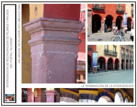 Intervención de restauración en pilares y arcadas del portal “Allende” de la ciudad de San Miguel de Allende, Gto.